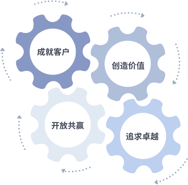 成就客户是一切决策的出发点,,创造价值是衡量所有工作的标准,,追求卓越是我们做事做人的态度,,,,开放共赢是我们的格局也是最终的结果。。。价值观的齿轮环环相扣,,,,推动着组织里的每个人不断向前。。